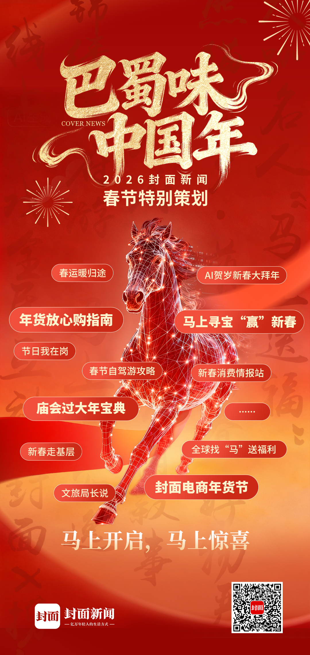 此外,封面新闻还将联合携程启动“全球找‘马’送福利”活动,为大家送上新春文旅大礼包,拿起手机拍一张与“马”相关的照片,就能触发奖励机制,超多免费景区门票放送!