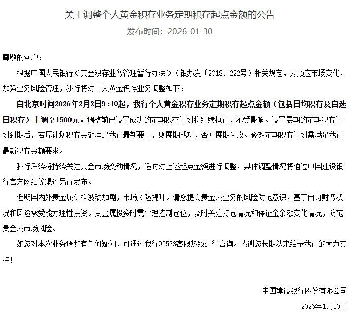 1月30日下午,建设银行发布消息,将上调个人黄金积存业务定期积存起点金额至1500元。